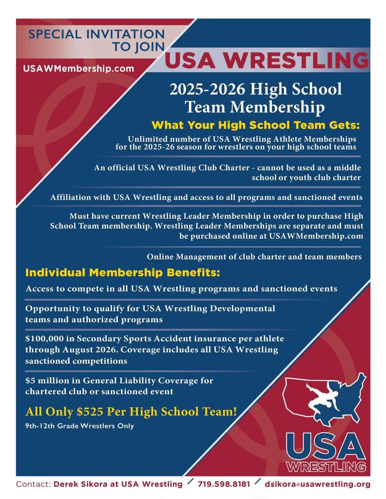 High School Team Membership Program- $525 includes your club charter AND a FULL ATHLETE memberships for EVERY member of your high school team. (ex. If you have 20 athletes on your team you would get 20 full memberships PLUS your club charter, a SAVINGS of $600). Available for high school teams only. BEST VALUE!! To get set up contact Derek Sikora at dsikora@usawrestling.org or call 719-598-8181 (office) or contact Ed Duncan by clicking HERE.